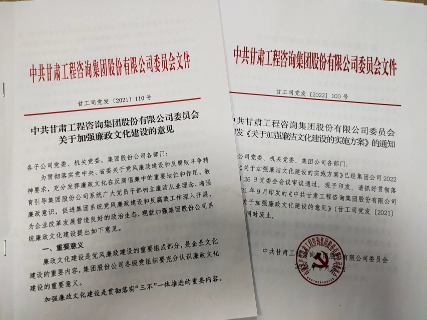 作為新組建的產(chǎn)業(yè)集團(tuán),甘肅工程咨詢集團(tuán)把資產(chǎn)整合、產(chǎn)業(yè)耦合和文化融合作為集團(tuán)公司組建的重要內(nèi)容,其中讓廉潔文化建設(shè)在企業(yè)文化建設(shè)中先行一步,早安排早部署,2021年9月集團(tuán)公司黨委研究印發(fā)《關(guān)于加強(qiáng)廉政文化建設(shè)的意見》,在中共中央辦公廳《關(guān)于加強(qiáng)新時代廉潔文化建設(shè)的意見》和省委《實施方案》印發(fā)后,又及時對標(biāo)、查缺補(bǔ)漏,2022年9月修訂印發(fā)《關(guān)于加強(qiáng)廉潔文化建設(shè)的實施方案》,為新時代集團(tuán)公司加強(qiáng)廉潔文化建設(shè)提供了指導(dǎo)。自組建以來,集團(tuán)公司廉潔文化建設(shè)力求在“內(nèi)化于心”上下功夫,在“外化于行”上求實效,引導(dǎo)干部職工廉潔從業(yè),廉潔用權(quán),積極營造“崇廉、尚廉、倡廉、守廉”的企業(yè)風(fēng)尚和發(fā)展氛圍。