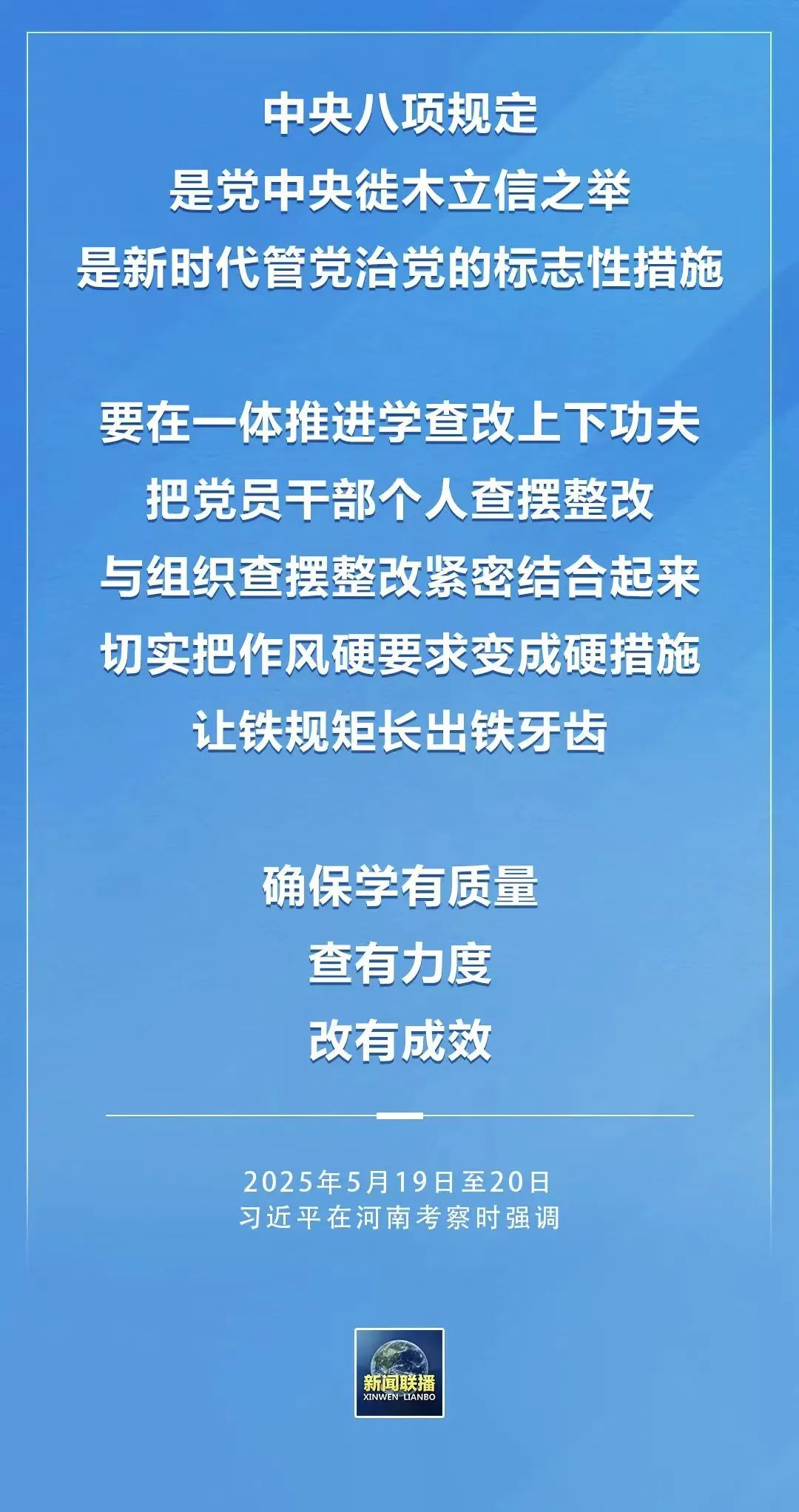 習近平總書記在河南考察時對深入貫徹中央八項規定精神學習教育提出明確要求,強調“要在一體推進學查改上下功夫”“確保學有質量、查有力度、改有成效”。