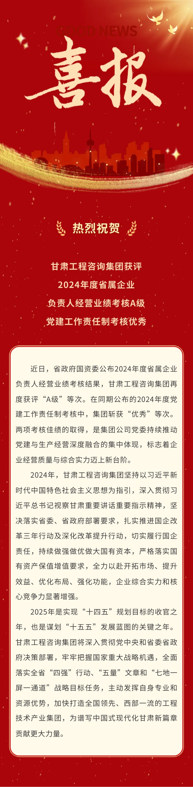 喜報 | 甘肅工程咨詢集團榮獲2024年度省屬企業考核“雙優”佳績:經營業績考核A級、黨建工作責任制考核優秀