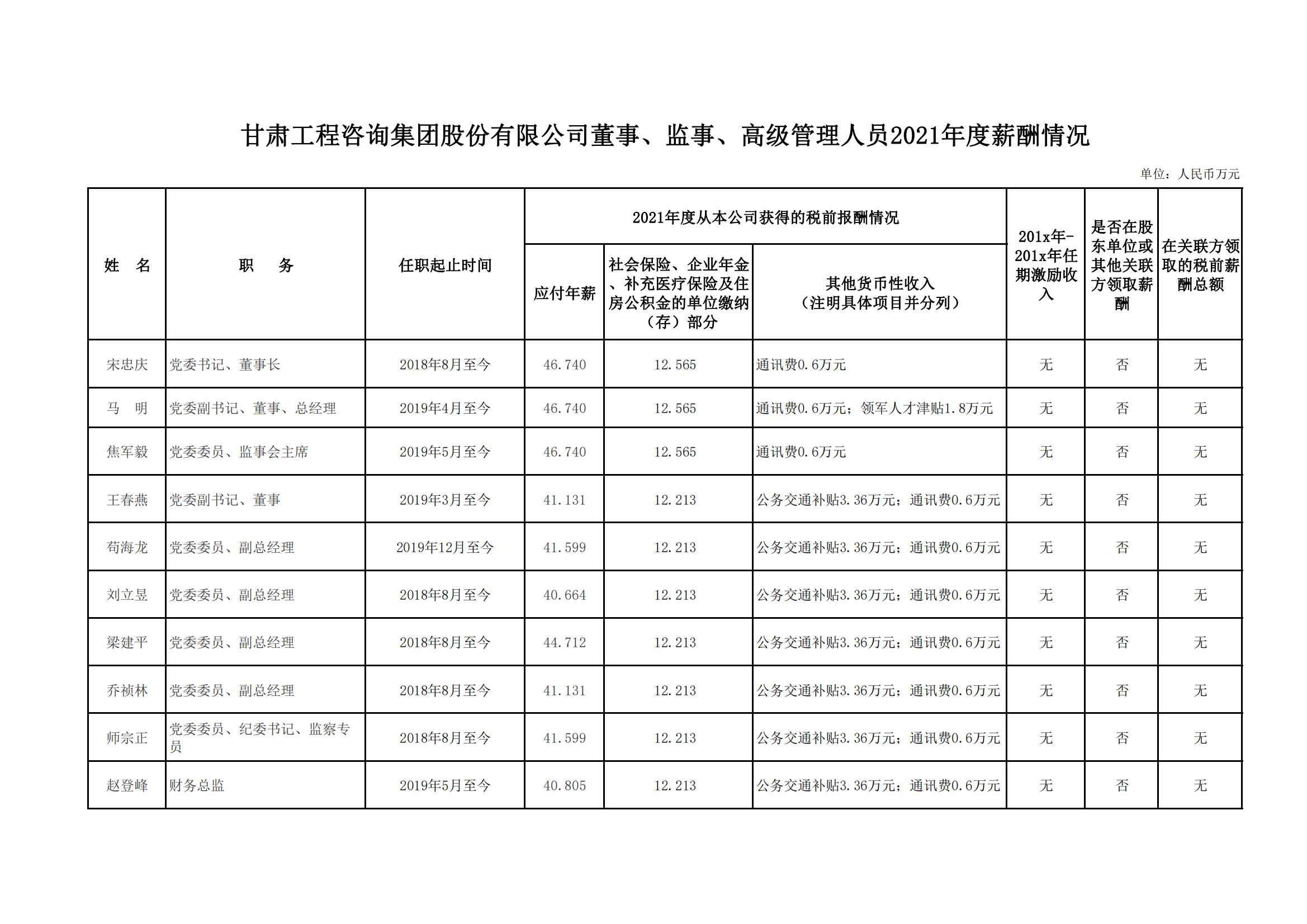 按照《關(guān)于印發(fā)甘肅省省屬國有企業(yè)負責人薪酬管理辦法的通知》(甘人社通〔2021〕310號)相關(guān)要求,現(xiàn)將甘肅工程咨詢集團股份有限公司負責人2021年度薪酬情況公示如下: