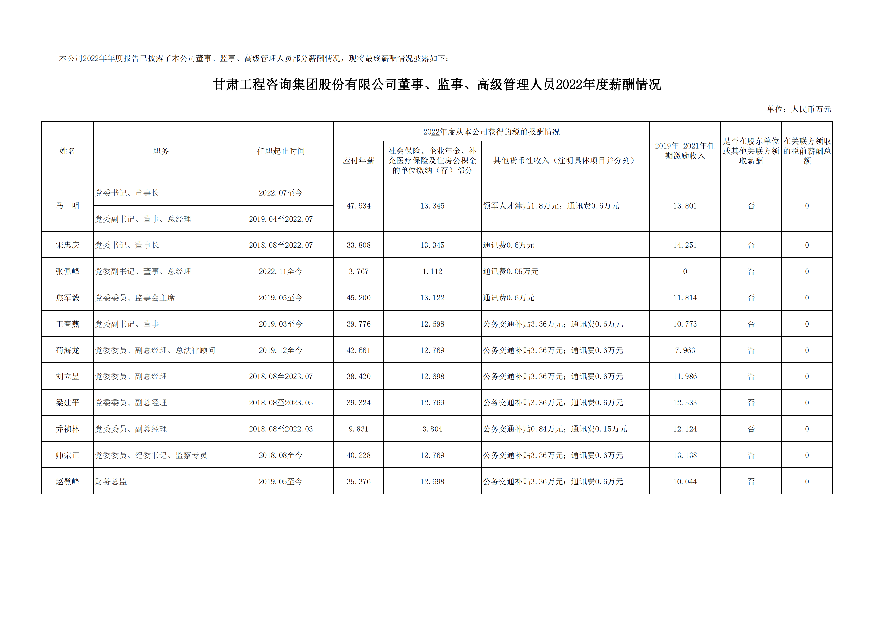 甘肅工程咨詢集團股份有限公司董事、監(jiān)事、高級管理人員2022年度薪酬情況及甘肅工程咨詢集團股份有限公司工資分配情況