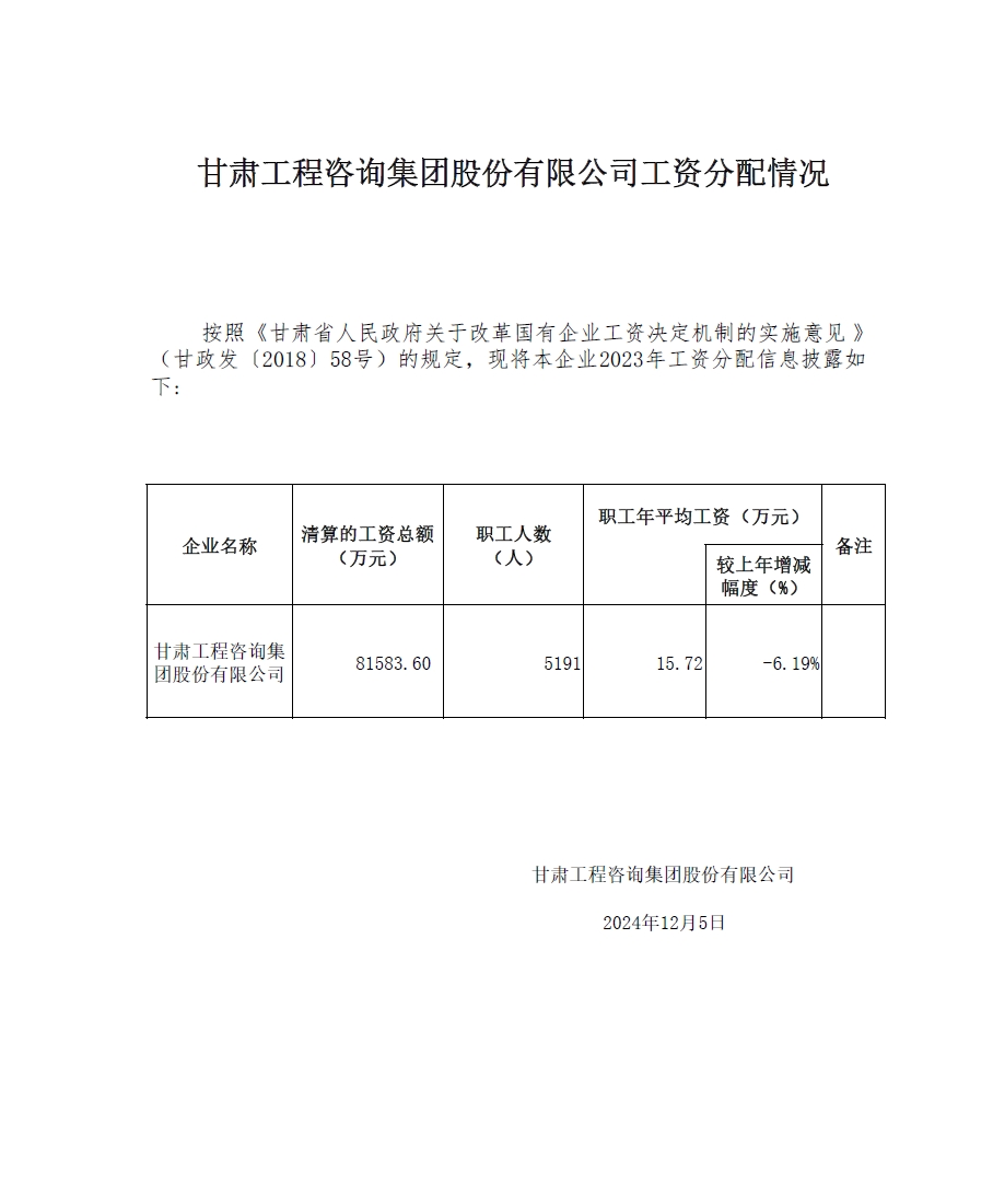 甘肅工程咨詢集團股份有限公司董事、監事、高級管理人員2023年度薪酬情況及甘肅工程咨詢集團股份有限公司工資分配情況