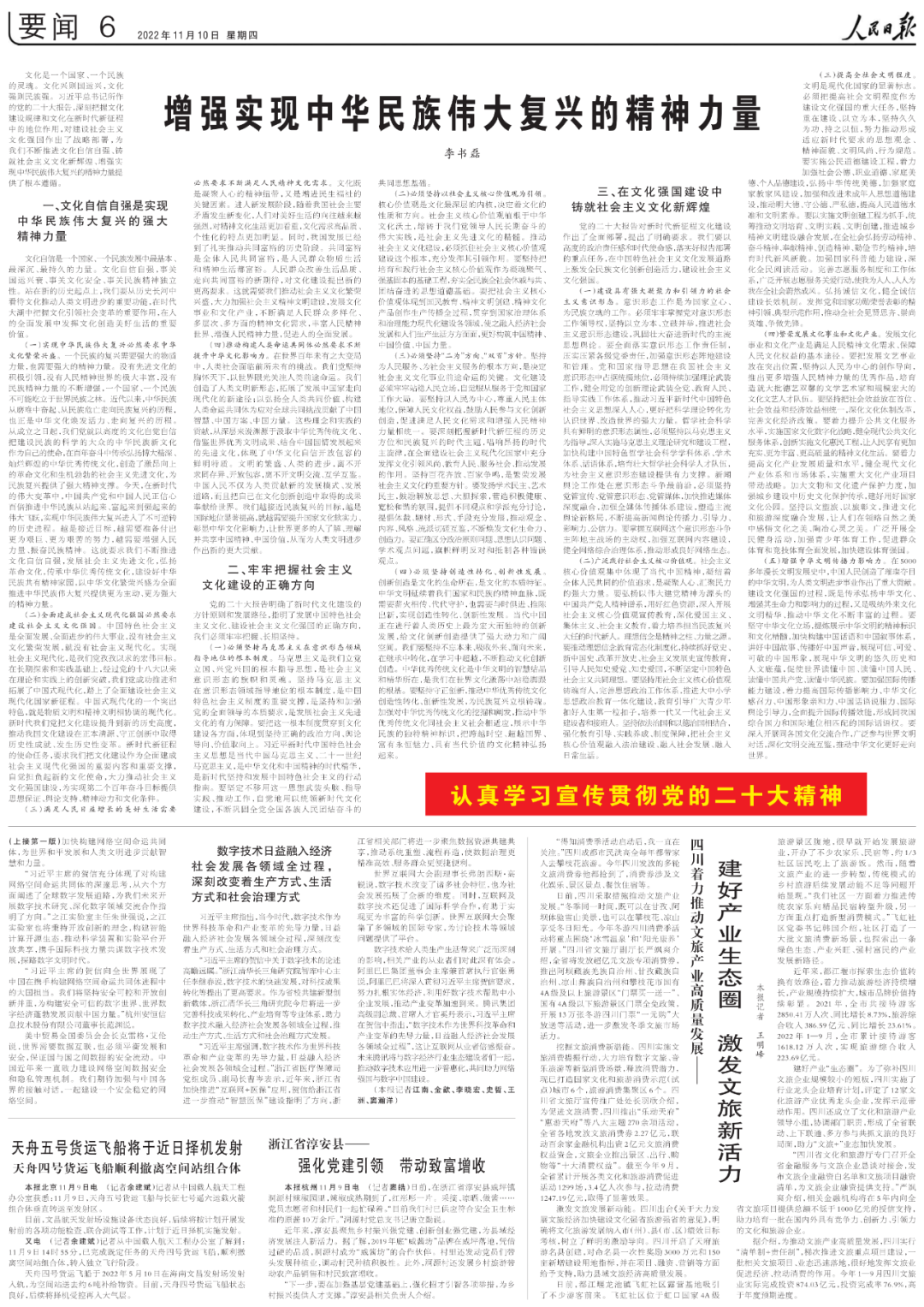 文化是一個國家、一個民族的靈魂。文化興則國運興,文化強則民族強。習近平總書記所作的黨的二十大報告,深刻把握文化建設(shè)規(guī)律和文化在新時代新征程中的地位作用,對建設(shè)社會主義文化強國作出了戰(zhàn)略部署,為我們不斷推進文化自信自強、鑄就社會主義文化新輝煌、增強實現(xiàn)中華民族偉大復興的精神力量提供了根本遵循。