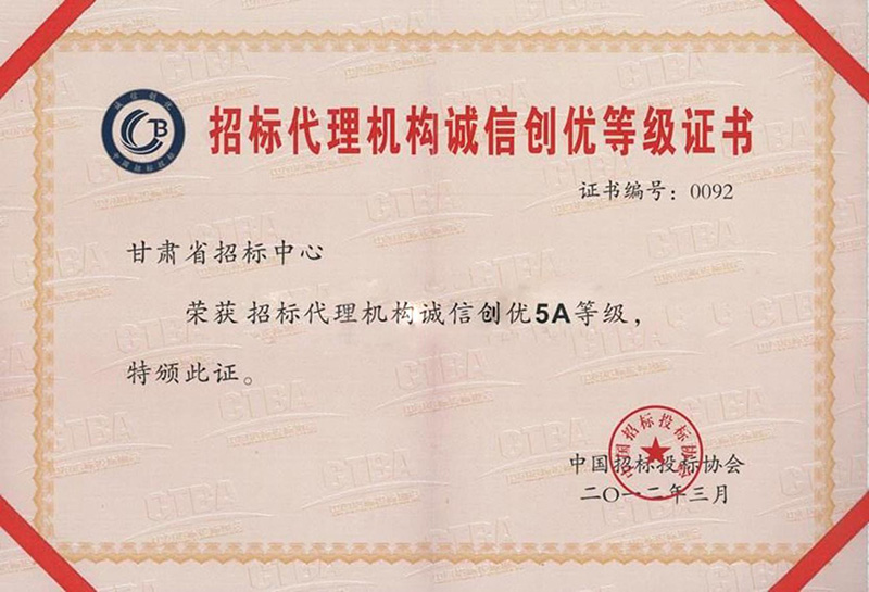 招標代理機構誠信創優登記證書